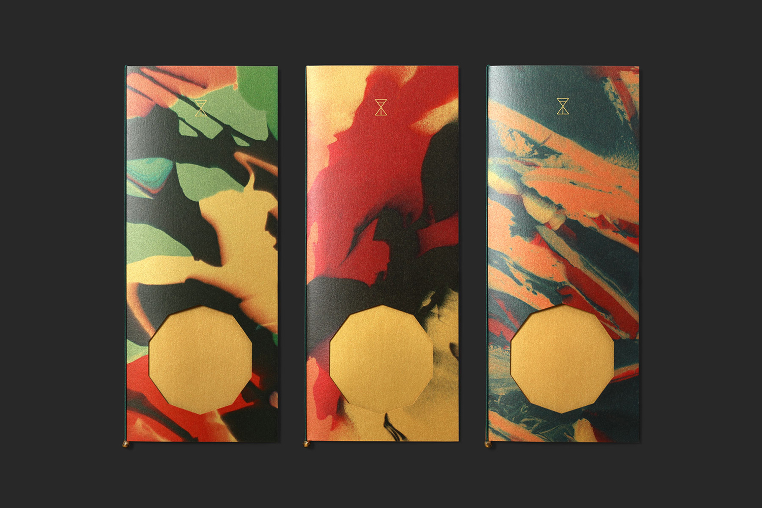 一個與時間和地點有關的游戲被封裝在一系列畫布的幾乎噴漆般的品質中,這些畫布在夏季和秋季色彩之間的形式和運動是自然和季節性的。金屬金色的紙托,用十邊形帶來溫暖,在畫布上切割,露出純金,為太陽主題賦予了一種時代感。