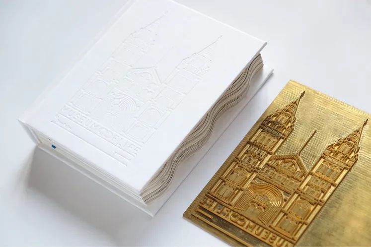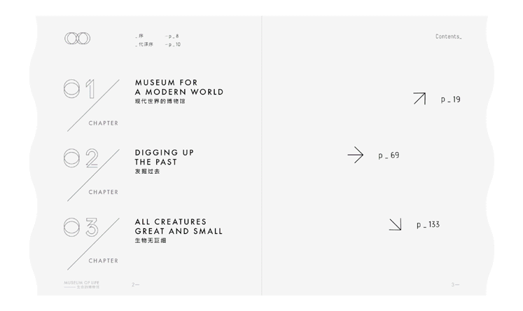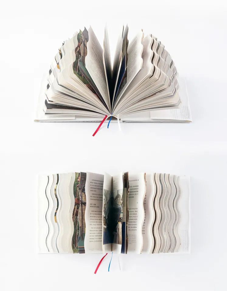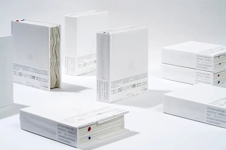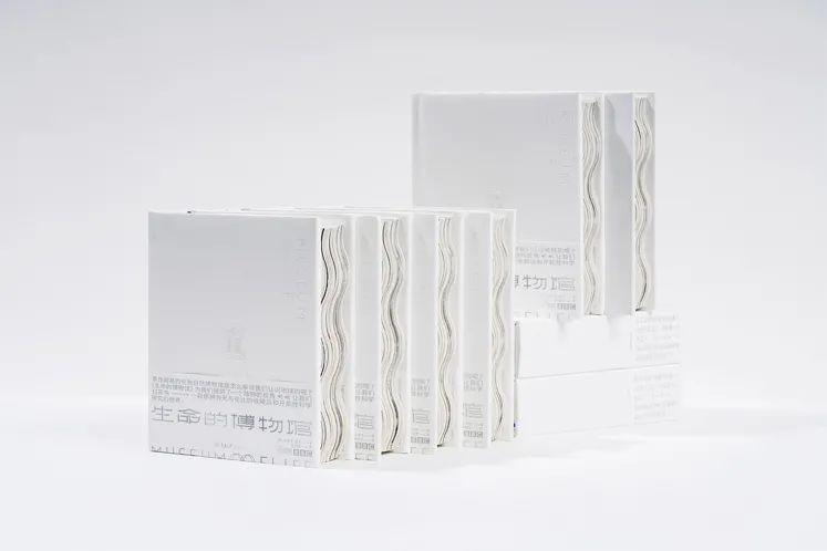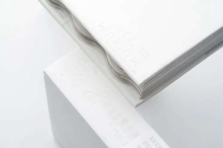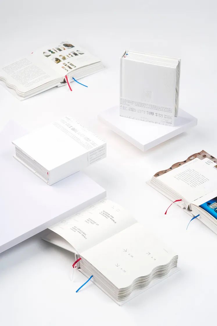 這本書被設(shè)計(jì)成很小的尺寸。書籍邊緣特別設(shè)計(jì)成波浪的形狀,使書本身有了更生動的“立體感”和“流動性”。紅色、白色和藍(lán)色的帶狀書簽也是生命的動脈和脈絡(luò)的象征。書,從它的內(nèi)部到外部,呈現(xiàn)大量的純白色。封面上的信息油墨印刷的,而是采用壓印工藝呈現(xiàn)在紙上的,直觀地表達(dá)了人們在博物館行走的感受,質(zhì)樸自然,同時(shí),也傳達(dá)出了從小細(xì)節(jié)到大畫面對自然生活的觀照。我們必須用心觀察我們自己眼睛里的自然,然后才能想象出一個(gè)不同的場景。